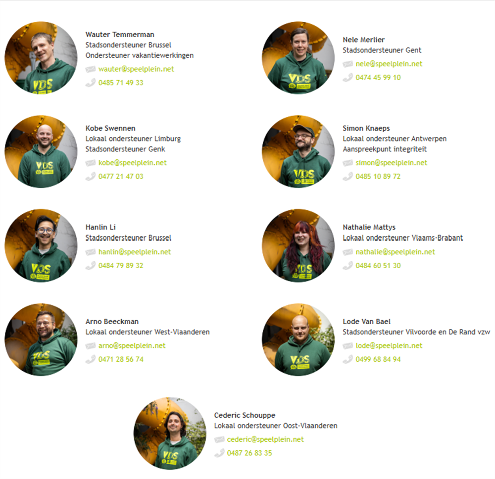 Gezien de VDS veel belang hecht aan lokaal werken, is de vertrouwensband tussen de speelpleinen en onze lokale speelpleinondersteuners vaak veel groter. Het is dan ook logisch dat zij in de praktijk het eerste aanspreekpunt zullen zijn en in samenspraak met Simon en Amir het nodige doen.
