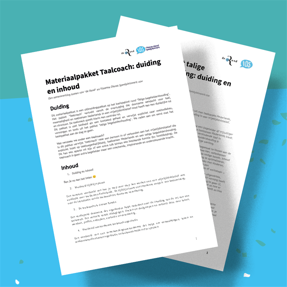 VDS maakte 2 DIY-pakketten in samenwerking met vzw De Rand, om je handvatten te geven om op een goede manier om te gaan met meertaligheid op je werking. De pakketten zijn zo opgesteld dat je zelf kan kiezen of je ze helemaal gebruikt, of er stukken uit plukt. Ga dus zelf aan de slag met dit pakket op de manier die het meest van pas komt voor jouw werking en zorg ervoor dat elk kind volop mee kan spelen, ook als taal een drempel is.