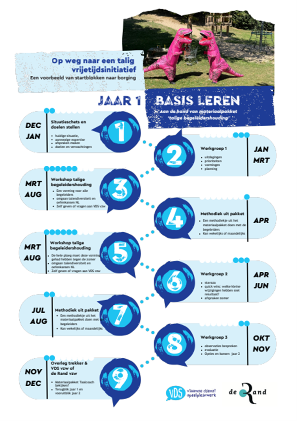 2: Voorbeeld tijdslijn proces: Dit is een voorbeeld van een traject waarbinnen je op een duurzame manier kan werken aan meer aandacht voor taal.